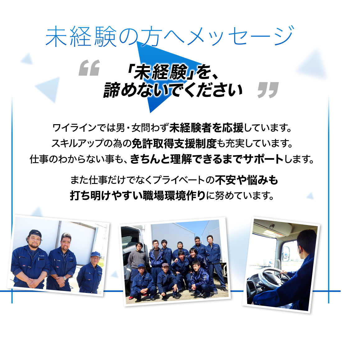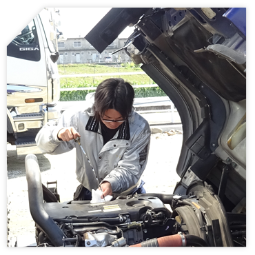 ![]() 出発前にトラックの点検をします。安全な運行をする為に非常に重要な作業です。 ・ブレーキの点検 ・タイヤの点検 ・方向指示器の点検 などが主な点検事項です。 |